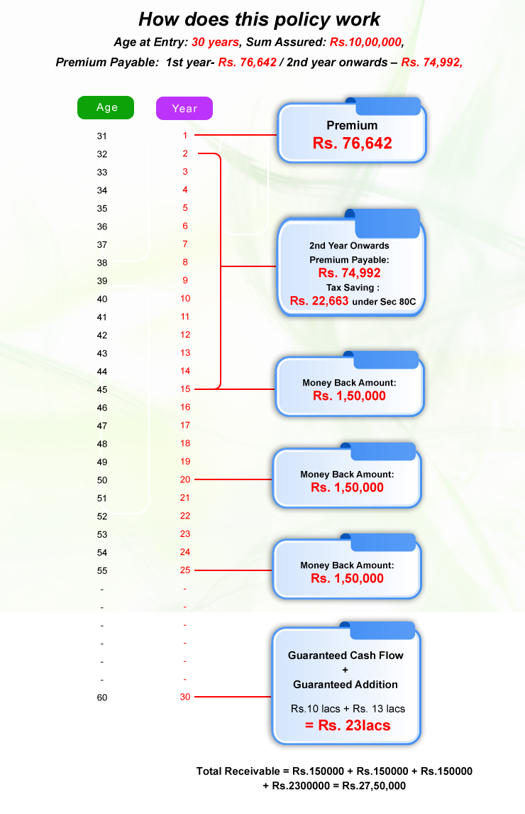 • At the maturity, entire sum assured without any deductions shall be paid to policyholder